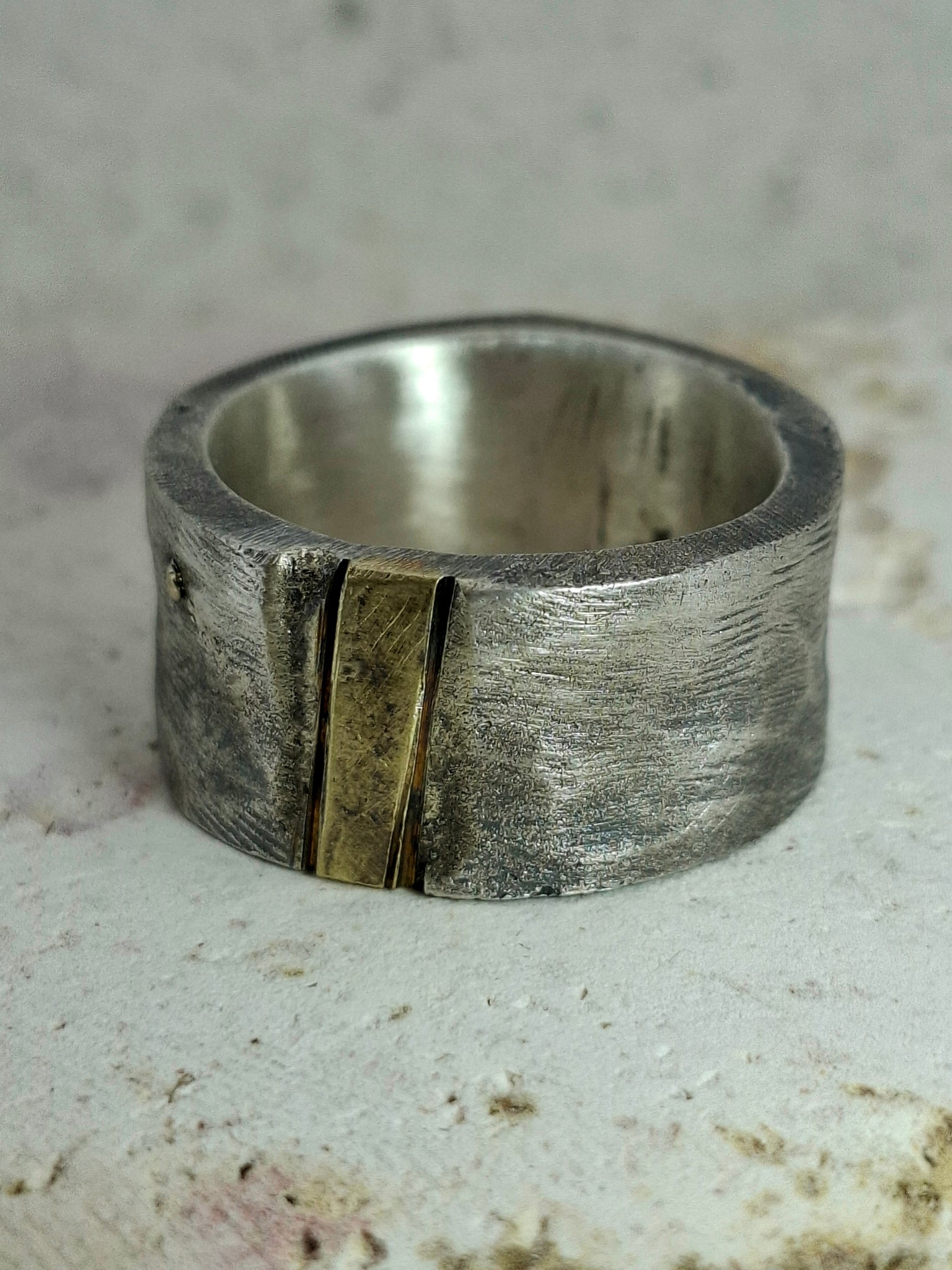 Los anillos "Rough" son piezas hechas de plata maciza 925, que se excede mucho de los pesos habituales. Son grandes, y cada uno tiene un acabado diferente. Están forjados a mano a grandes temperaturas con fuego, fuerza y martillo.